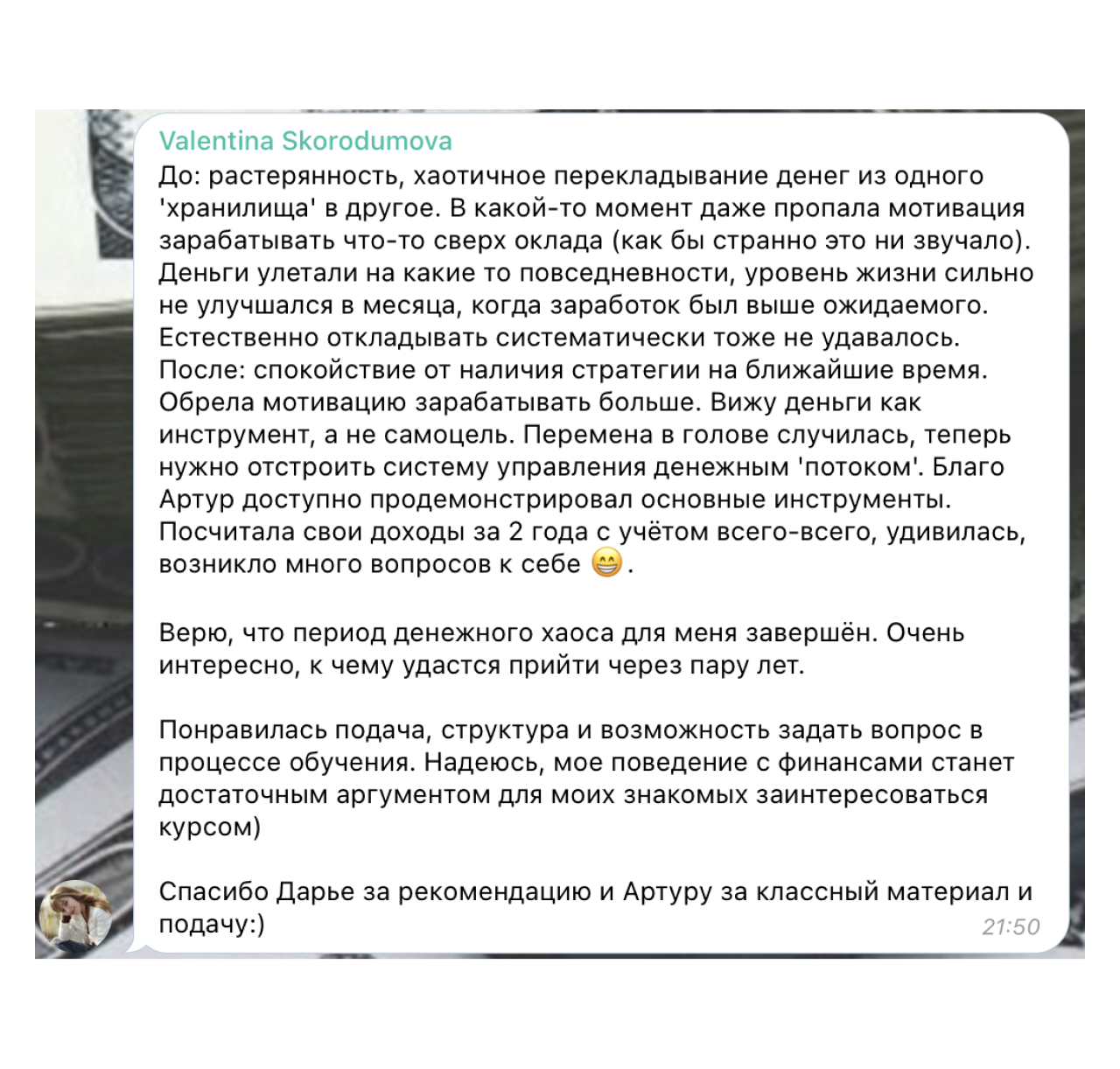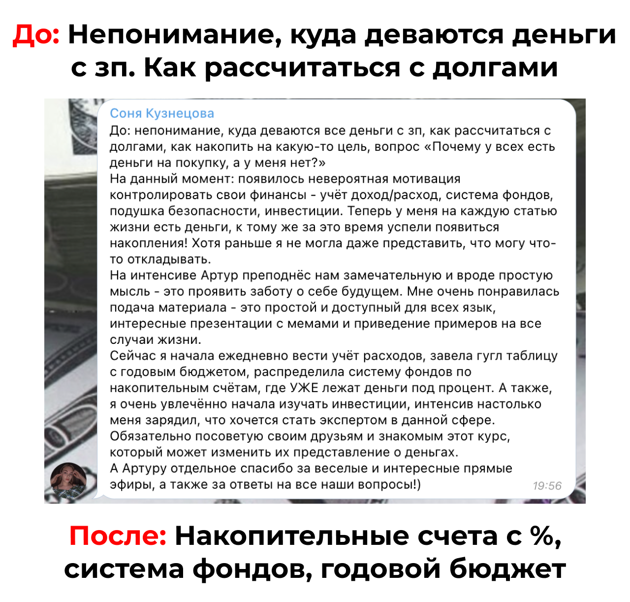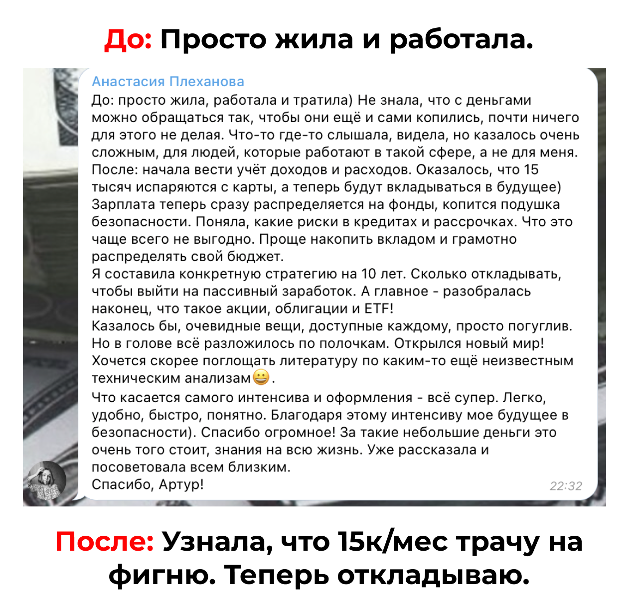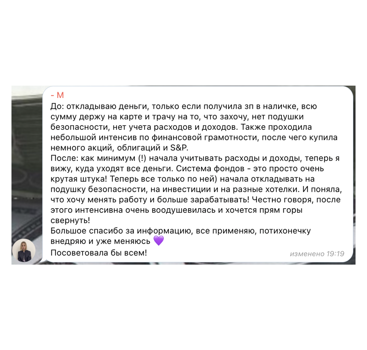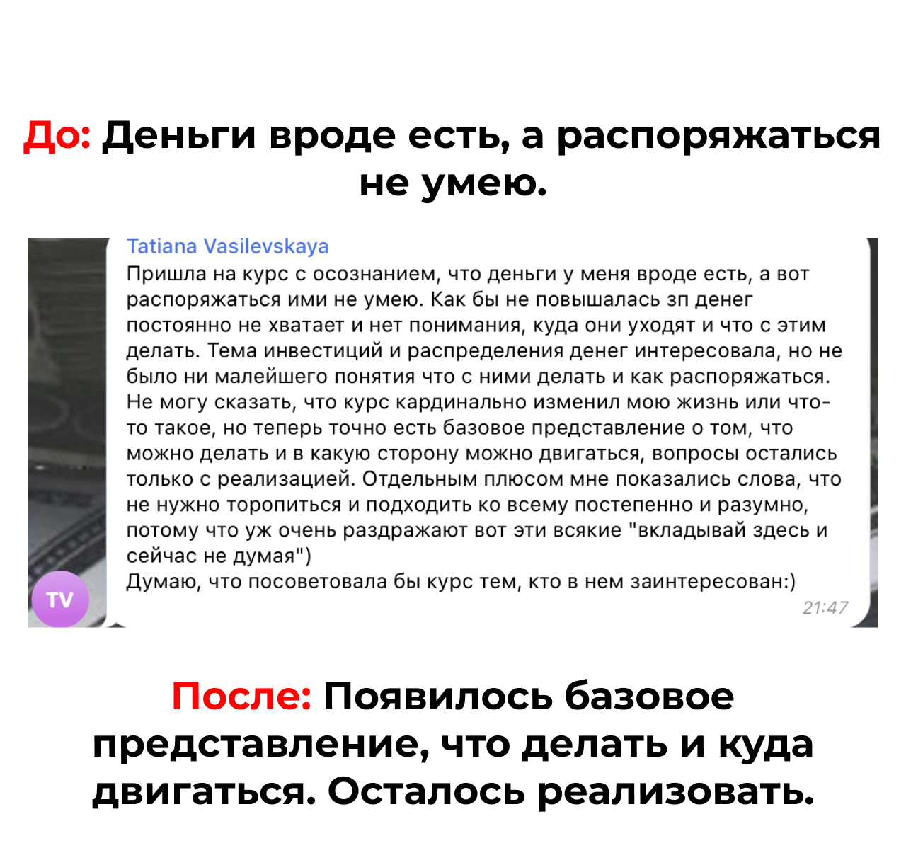 До: просто жила, работала и тратила) Не знала, что с деньгами можно обращаться так, чтобы они ещё и сами копились, почти ничего для этого не делая. Что-то где-то слышала, видела, но казалось очень сложным, для людей, которые работают в такой сфере, а не для меня.