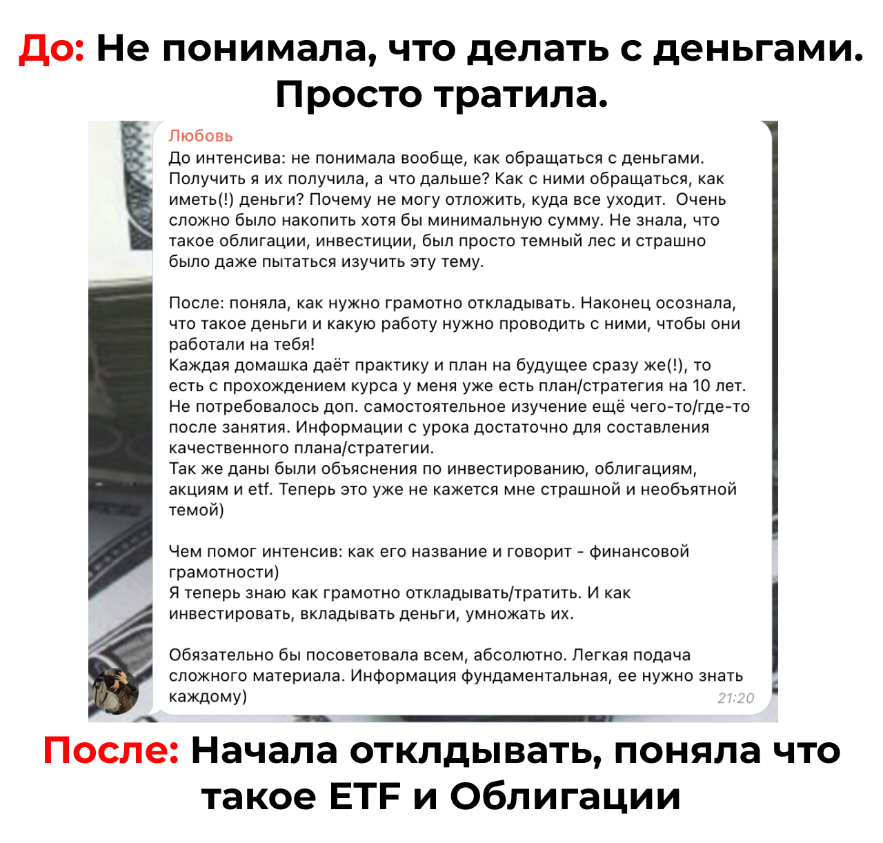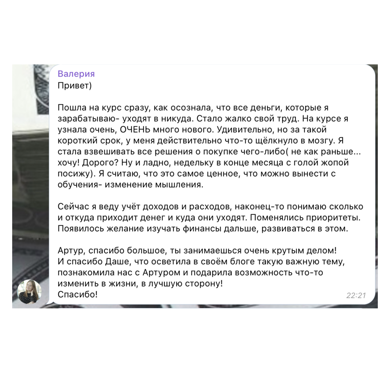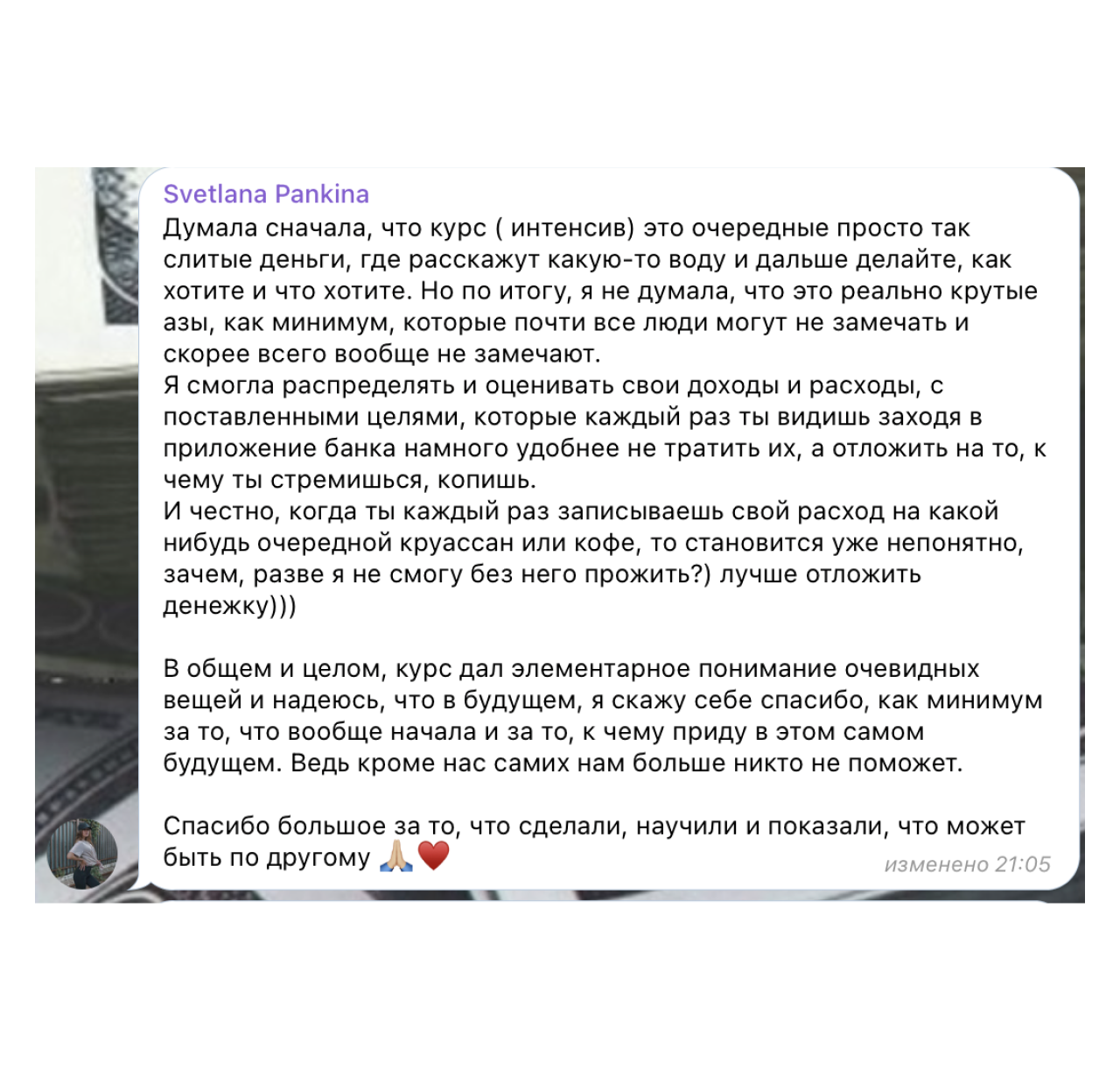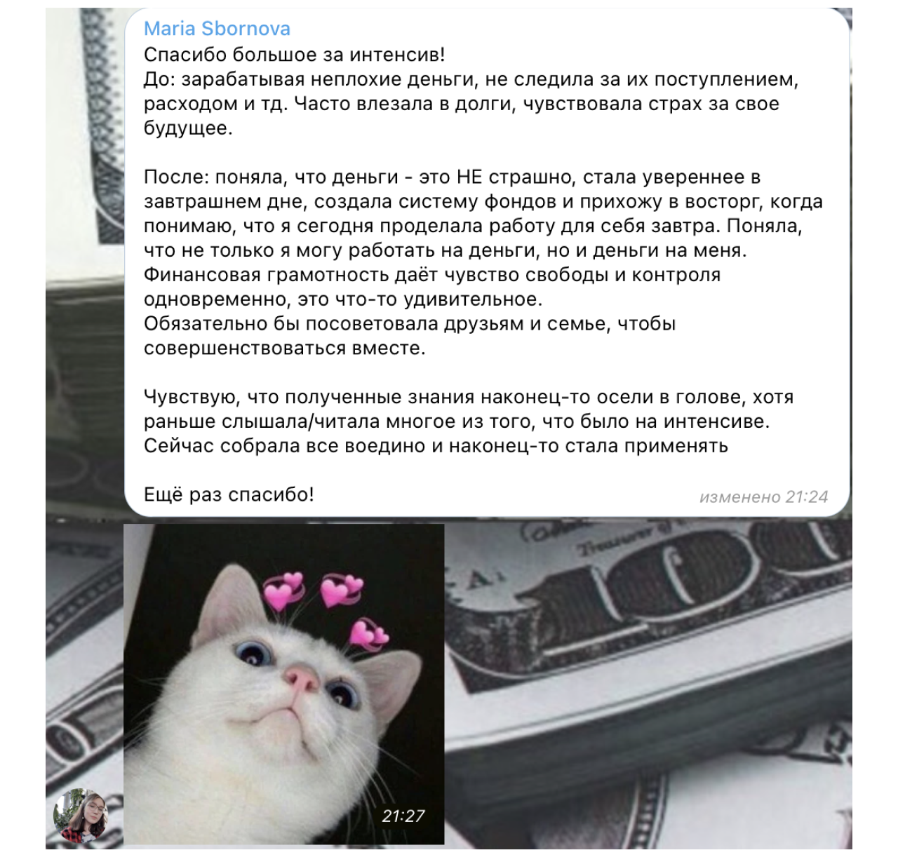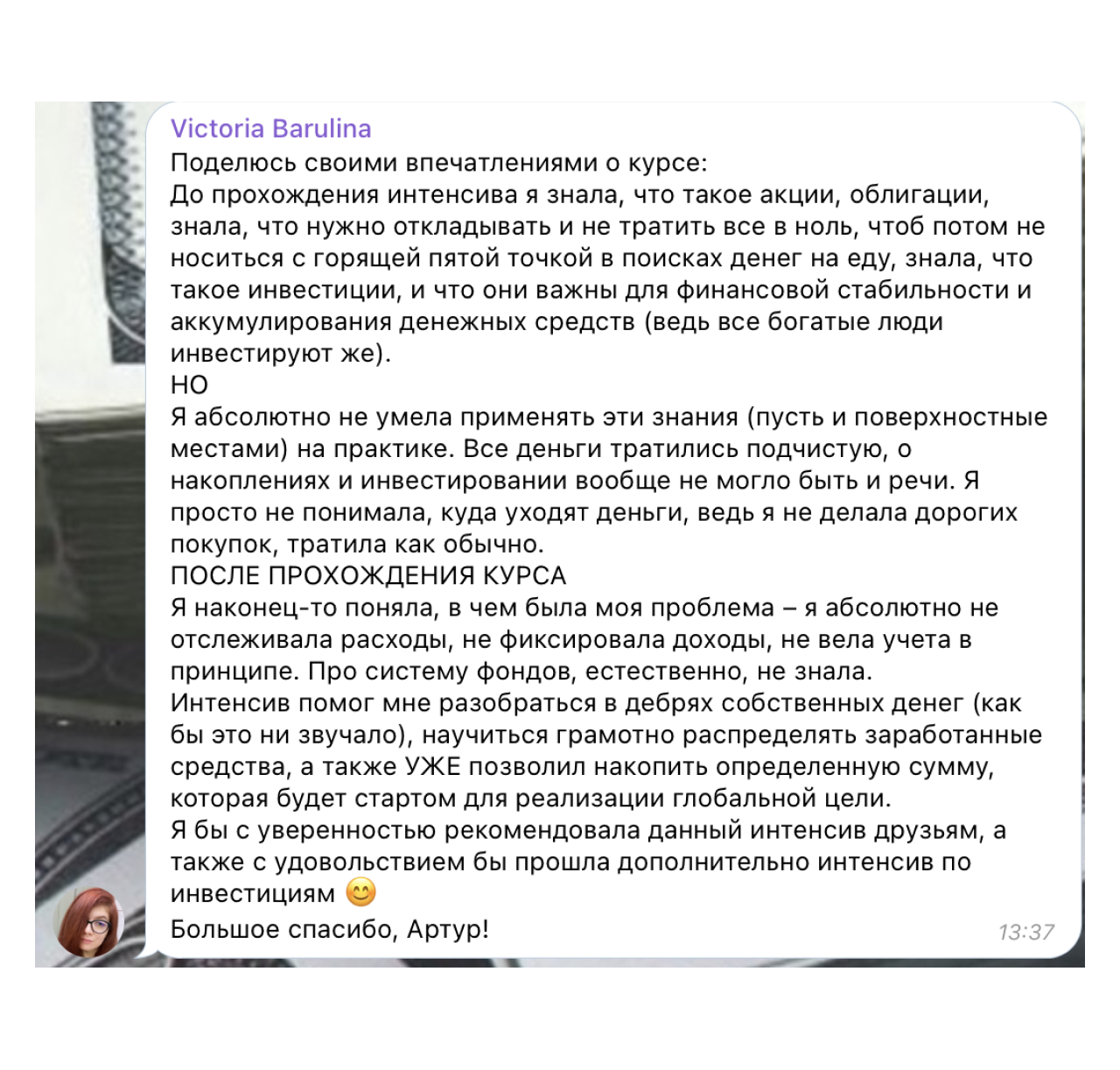 До: просто жила, работала и тратила) Не знала, что с деньгами можно обращаться так, чтобы они ещё и сами копились, почти ничего для этого не делая. Что-то где-то слышала, видела, но казалось очень сложным, для людей, которые работают в такой сфере, а не для меня.