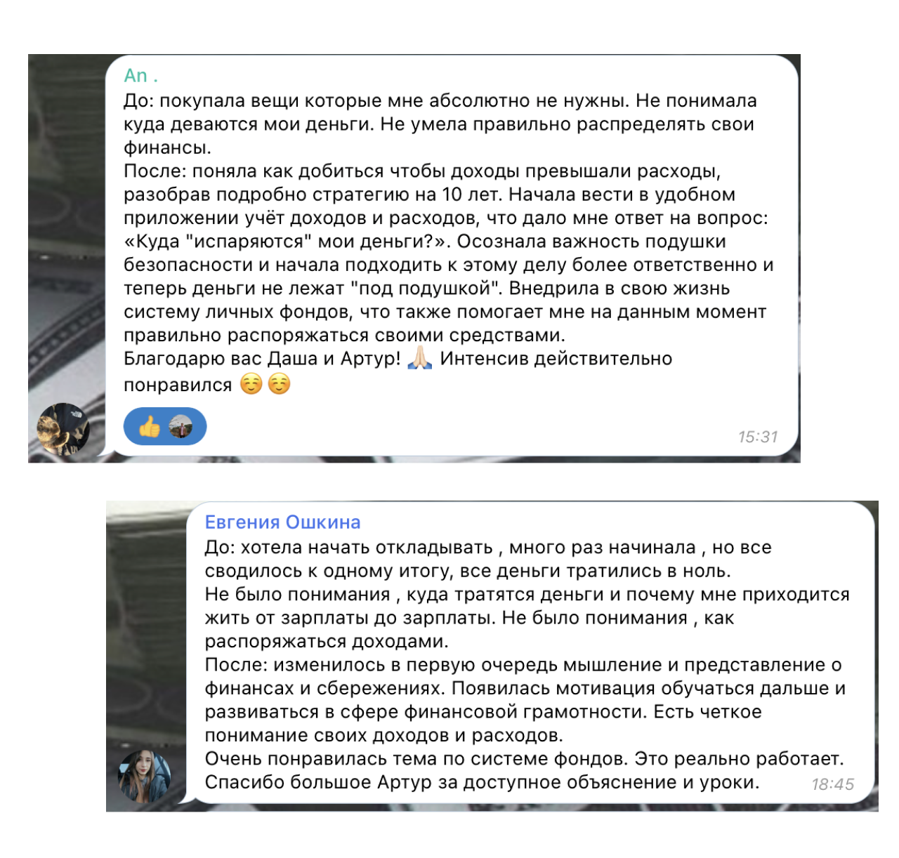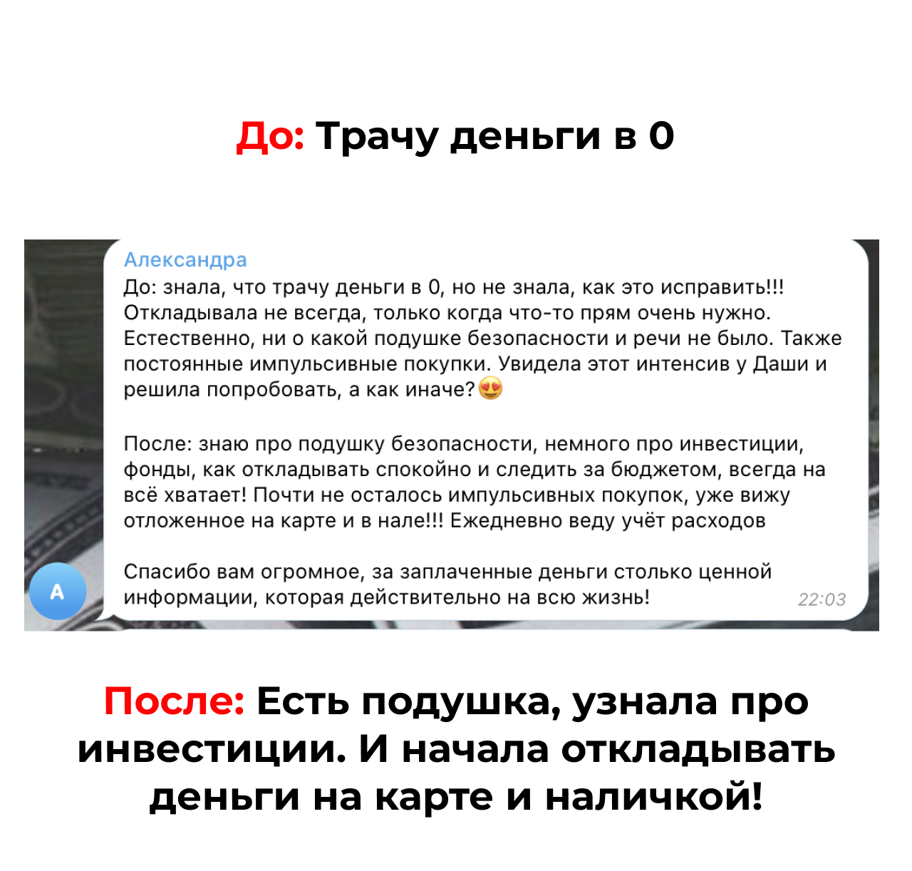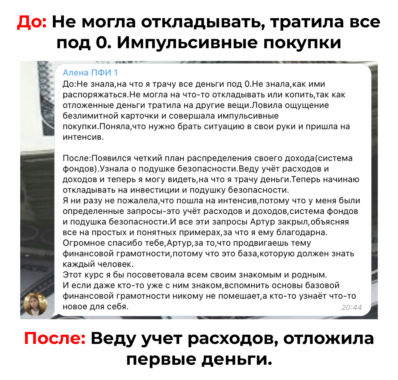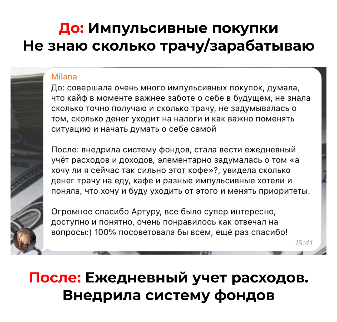 После: начала вести учёт доходов и расходов. Оказалось, что 15 тысяч испаряются с карты, а теперь будут вкладываться в будущее) Зарплата теперь сразу распределяется на фонды, копится подушка безопасности. Поняла, какие риски в кредитах и рассрочках. Что это чаще всего не выгодно. Проще накопить вкладом и грамотно распределять свой бюджет.