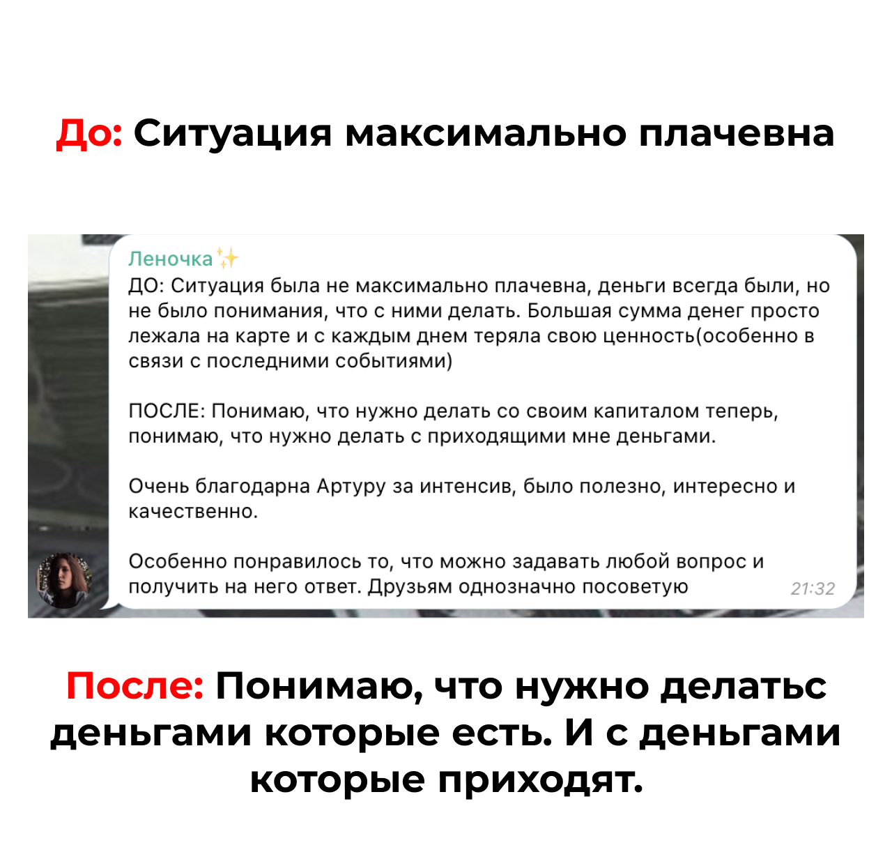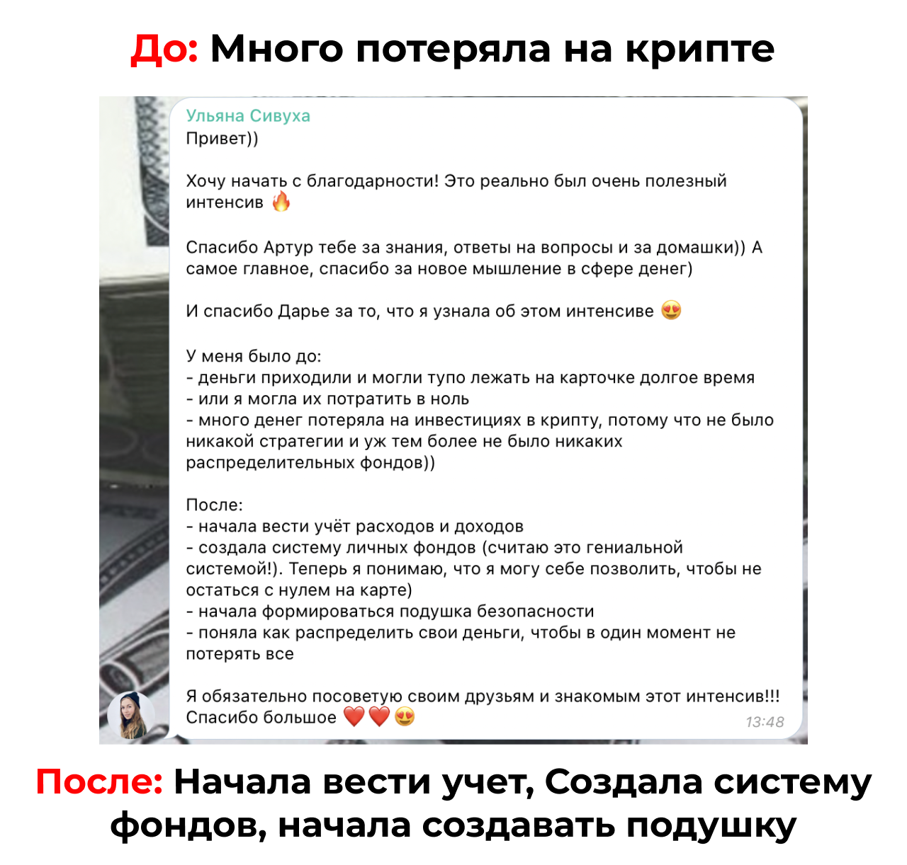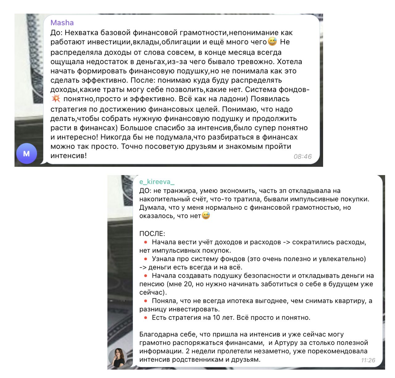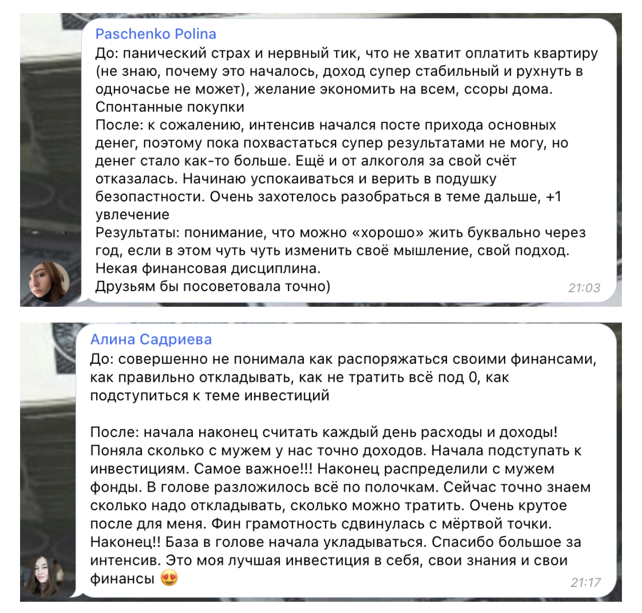 После: начала вести учёт доходов и расходов. Оказалось, что 15 тысяч испаряются с карты, а теперь будут вкладываться в будущее) Зарплата теперь сразу распределяется на фонды, копится подушка безопасности. Поняла, какие риски в кредитах и рассрочках. Что это чаще всего не выгодно. Проще накопить вкладом и грамотно распределять свой бюджет.