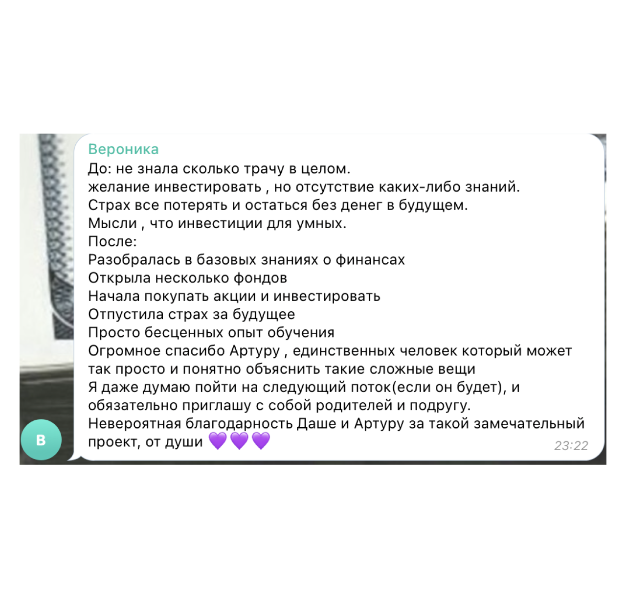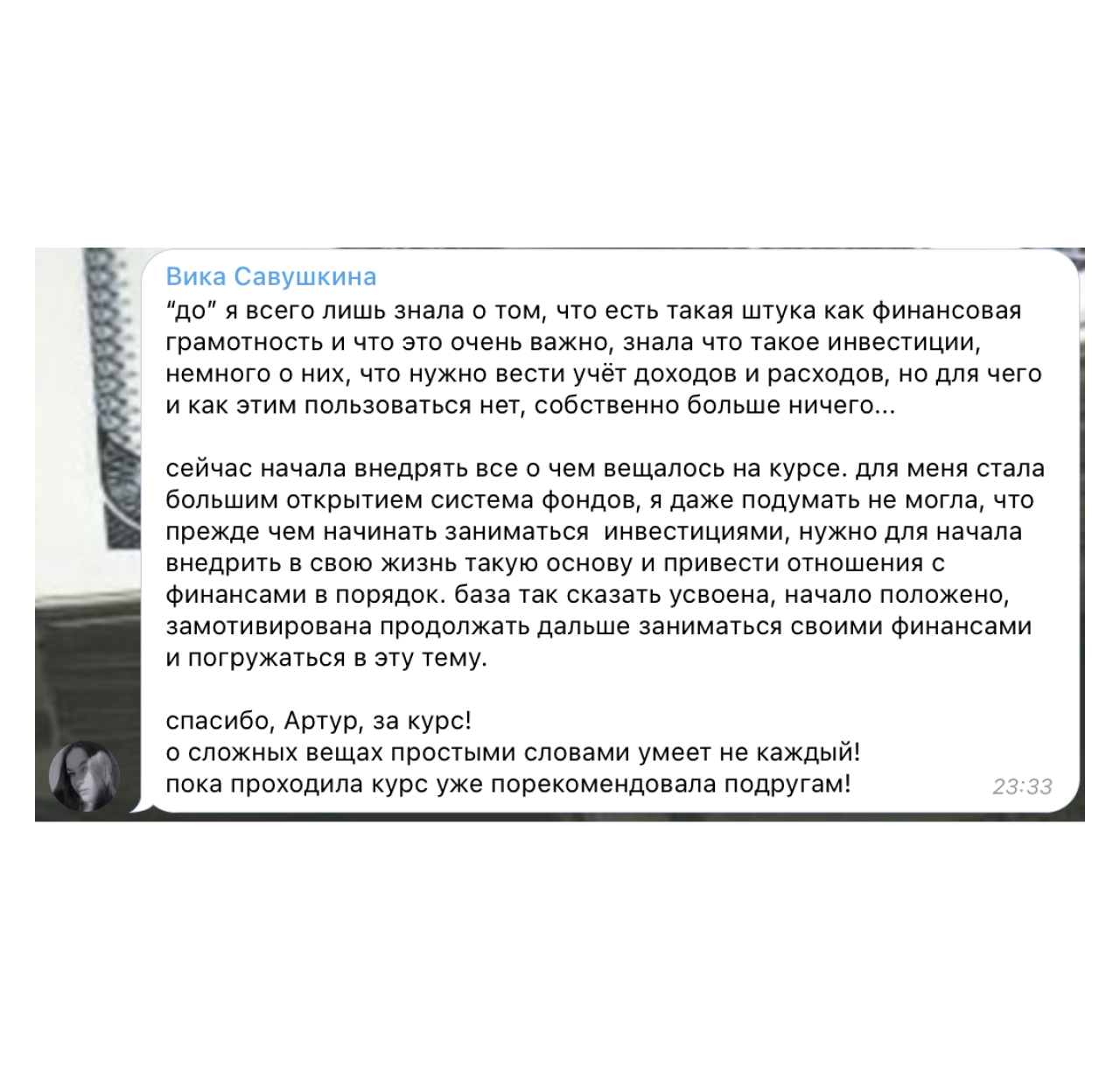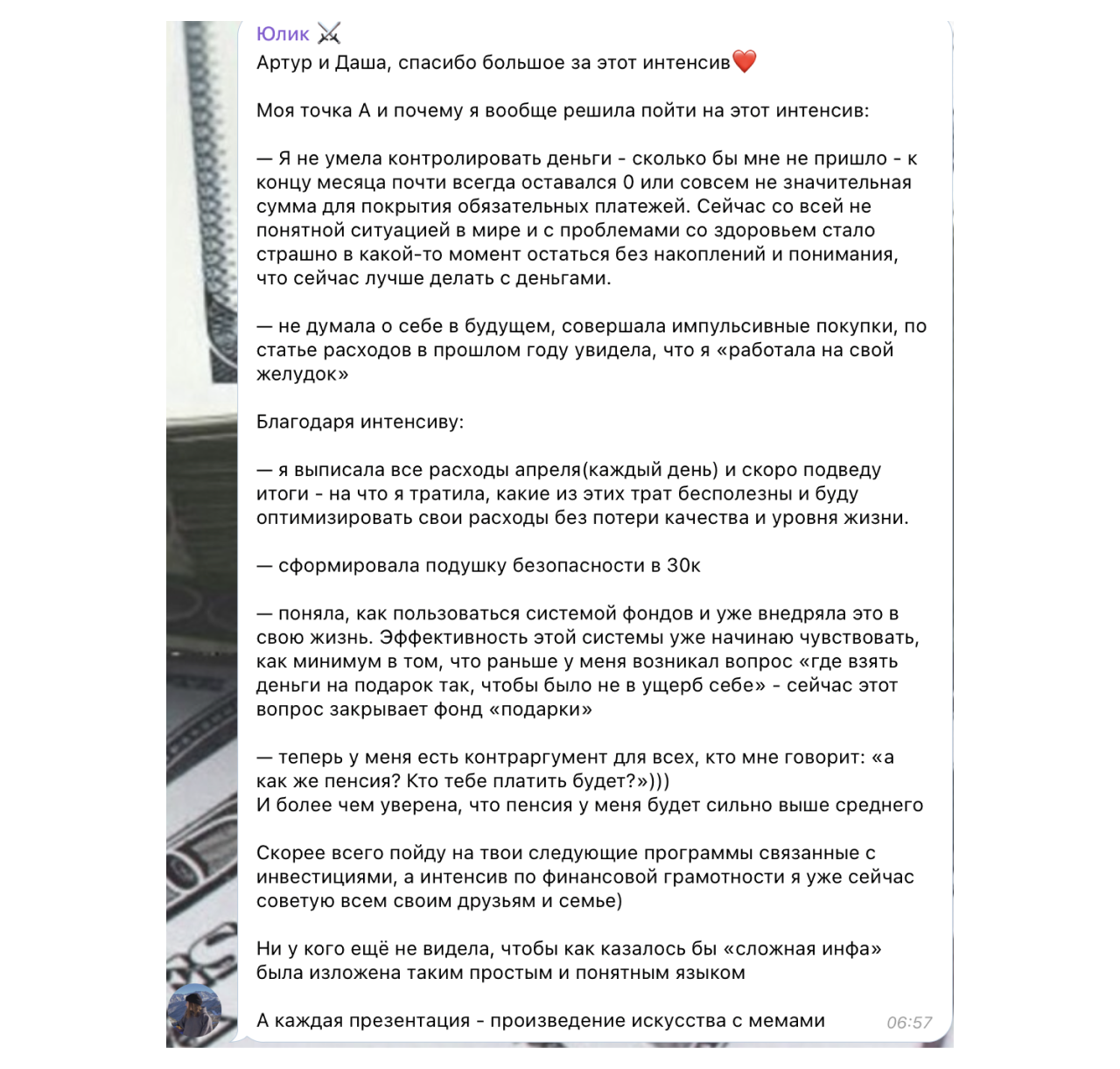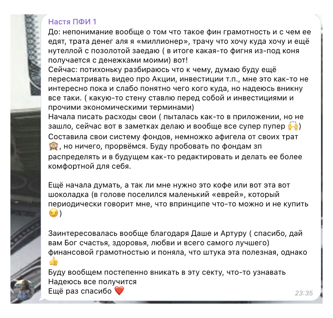 После: начала вести учёт доходов и расходов. Оказалось, что 15 тысяч испаряются с карты, а теперь будут вкладываться в будущее) Зарплата теперь сразу распределяется на фонды, копится подушка безопасности. Поняла, какие риски в кредитах и рассрочках. Что это чаще всего не выгодно. Проще накопить вкладом и грамотно распределять свой бюджет.