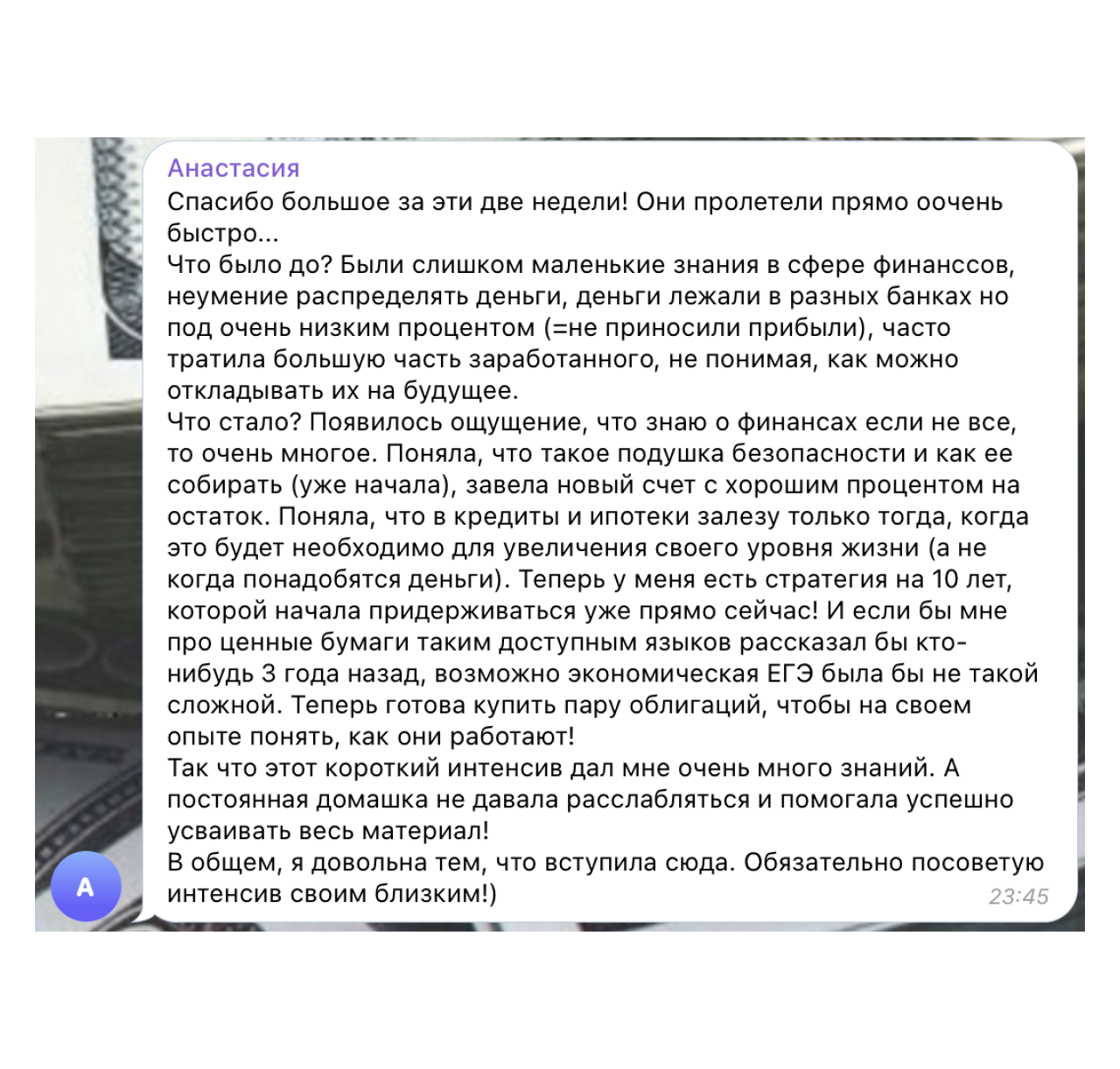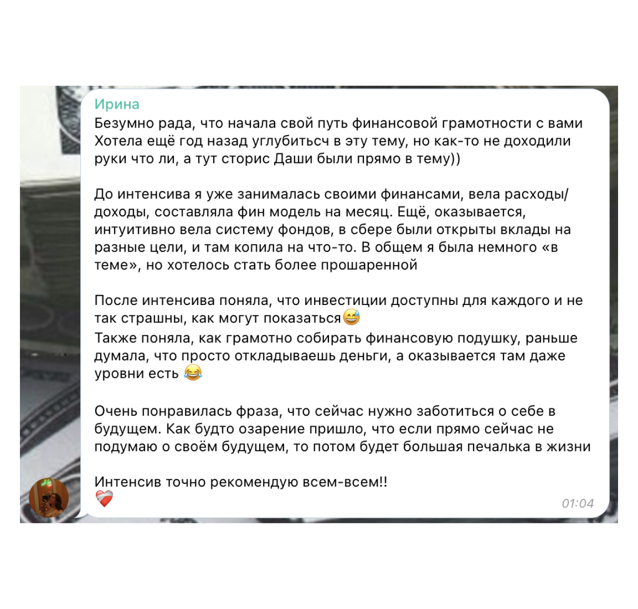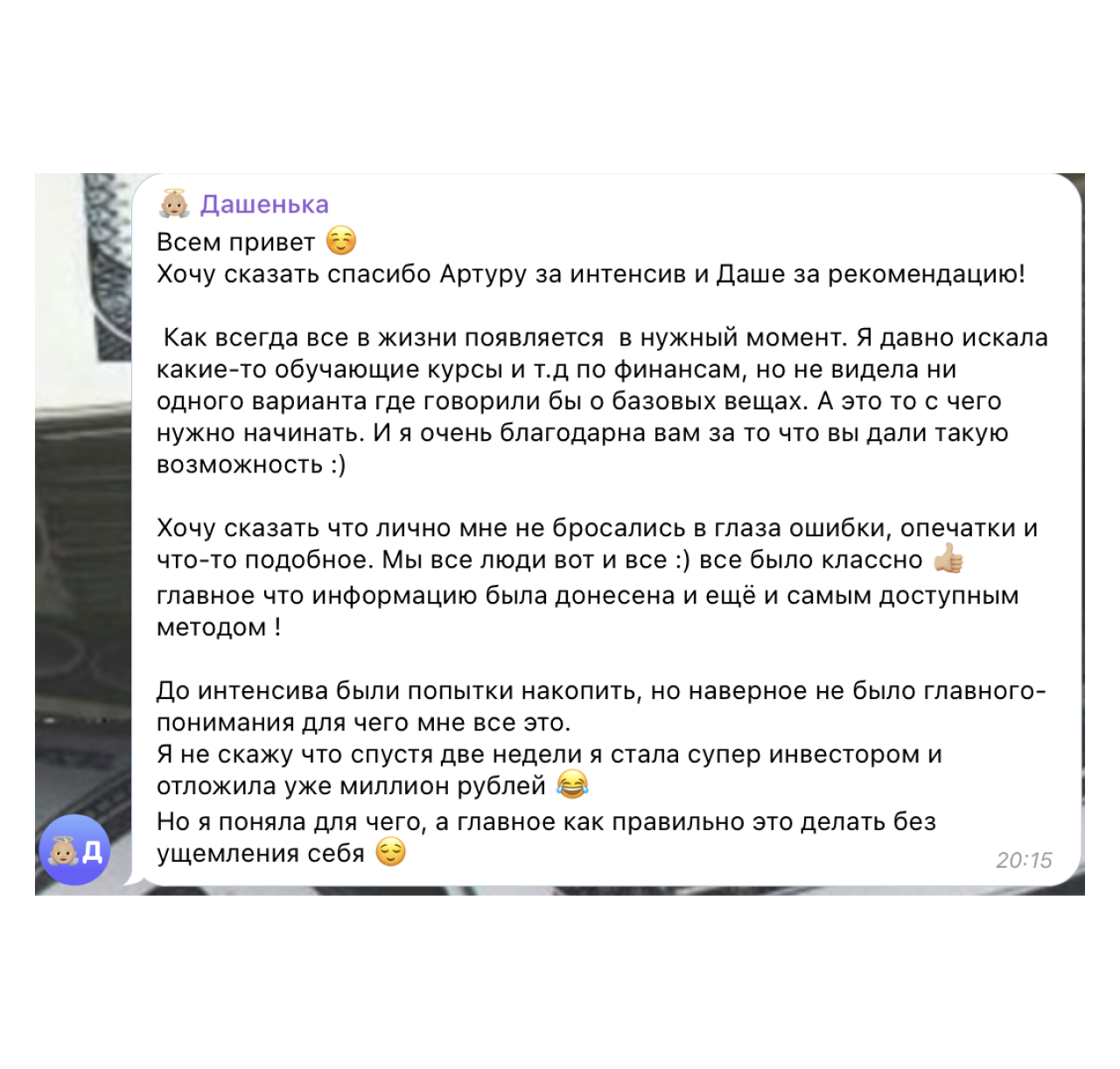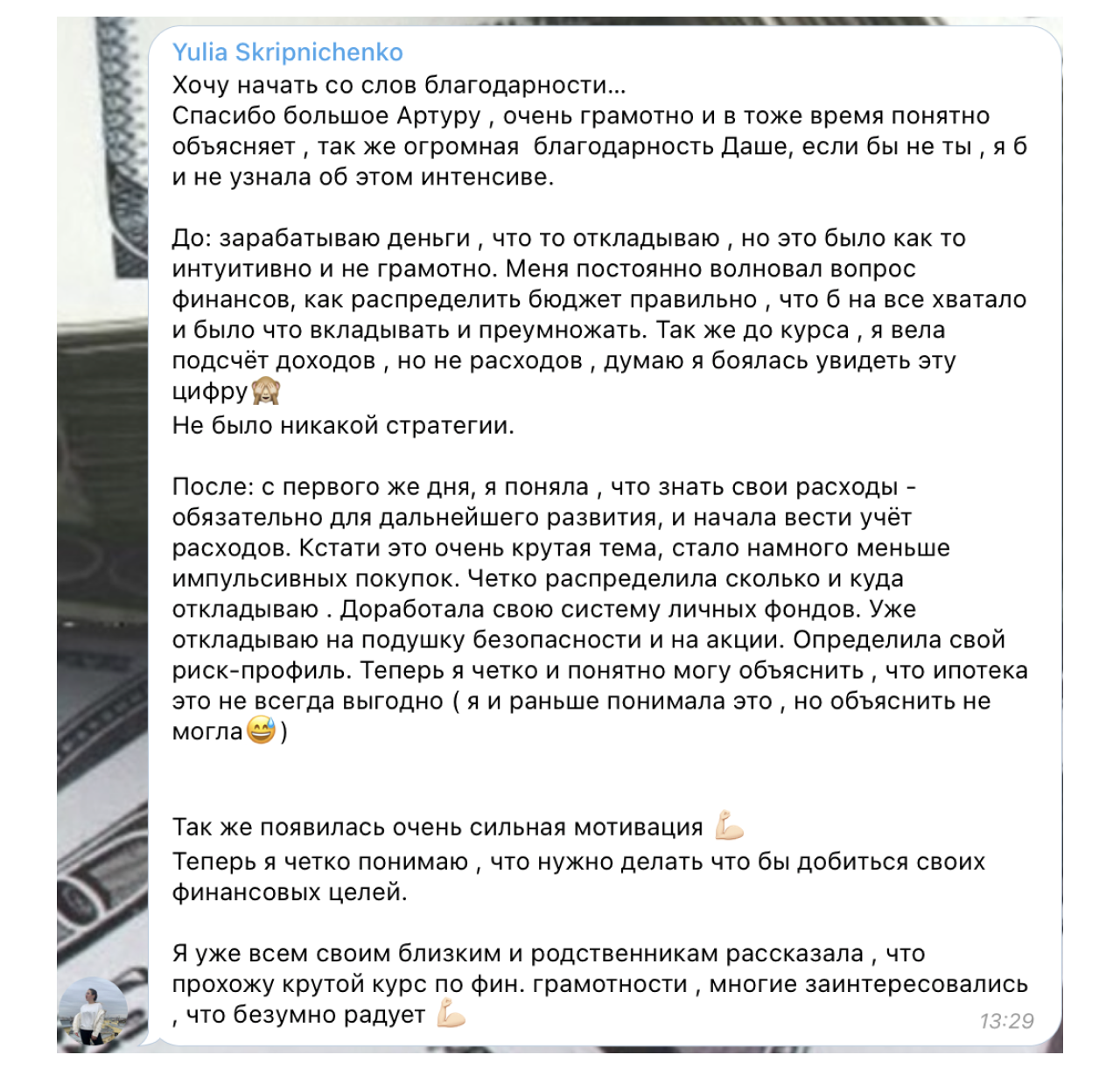 Что касается самого интенсива и оформления - всё супер. Легко, удобно, быстро, понятно. Благодаря этому интенсиву мое будущее в безопасности). Спасибо огромное! За такие небольшие деньги это очень того стоит, знания на всю жизнь. Уже рассказала и посоветовала всем близким.