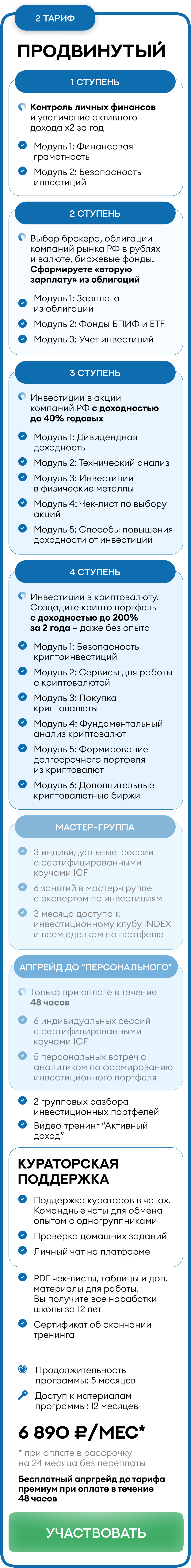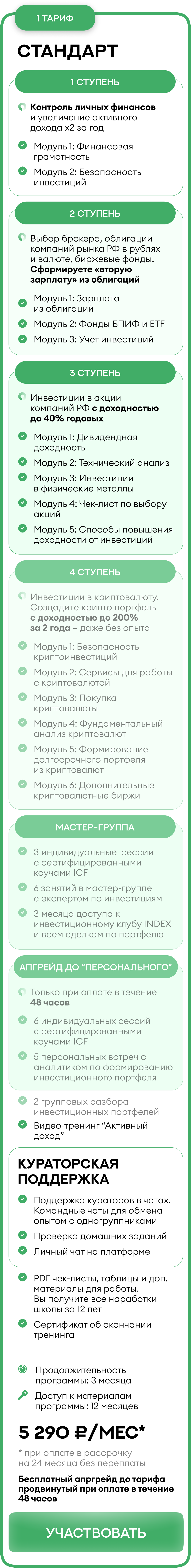 Соберёте сбалансированный инвестиционный портфель из дивидендных акций и акций «роста» с доходностью до 40% годовых и будете понимать, как управлять им самостоятельно — спокойно, без риска и лишних сложностей.